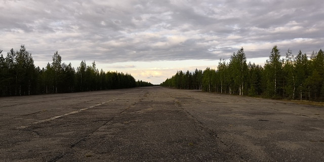 Насладившись природными видами, отбыл в Гирвас. На подъезде к нему свернул направо в лес и прокатился по взлетке заброшенного аэродрома. С дороги к аэродрому ведет множество укатанных песчаных грунтовок. Едьте по любой - не ошибетесь! ВПП в принципе ровная, асфальтированная. Какие-то самолеты сажать вполне можно. Прокатился я от края и до края. Естественно в длину. Начало или конец у ВПП определить проблематично, так как самолеты могут взлетать и садиться в любую сторону, в зависимости от направления ветра. Идеально ровным асфальтовое покрытие взлетки не назовешь - меленькие неровности имеются. Можно сравнить с легкой рябью на воде. Ехал около 70 км/ч. Быстрее можно было, но не комфортно - я же не ставил никаких рекордов.