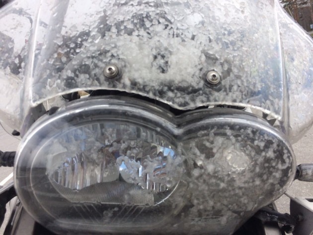 Погода совсем распоясалась и стала посыпать нас снежком. Очень красиво смотрятся снежинки, летящие тебе навстречу, как космические звёздочки, когда валишь на хорошей скорости. Вот только визор приходилось очищать от налипающего снега.
