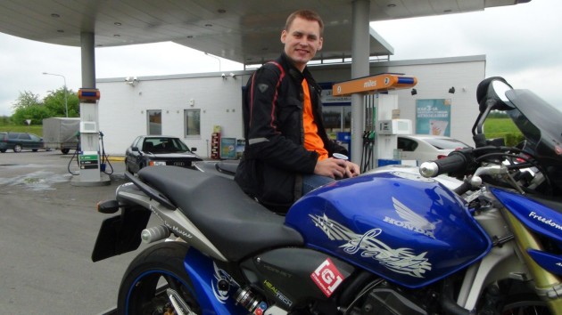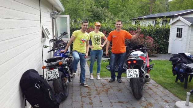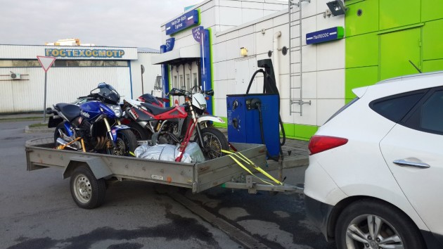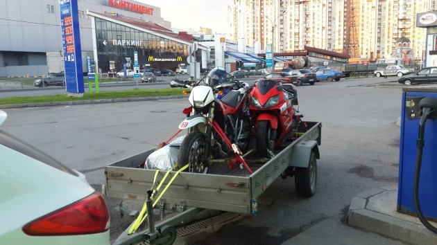 Итак, перво-наперво к нам приехал Алексей Жуков из Москвы. Его выгрузили на заправке возле метро Звёздная, где я с ним и встретился. Он грустно прогуливался взад-вперёд возле своего мотоцикла, ожидая, когда придет Сергей Пекутко, директор генерального спонсора нашей поездки - Мотошколы "А" () - на машине, чтобы погрузить мотоцикл.