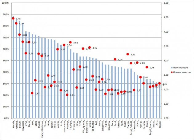 Всего в опросе приняло участие чуть более 170 трудолюбивых мотоциклистов, каждый из которых оценил качество 47 брендов.