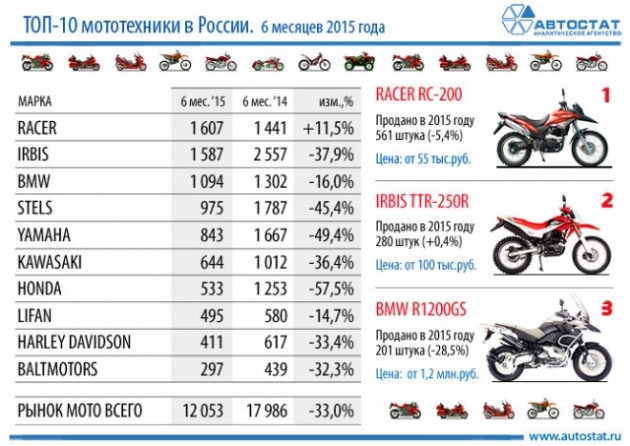 Автостат пришел к выводу, что за первое полугодие 2015 года российский рынок мототехники сократился, как минимум, на 33%, то есть ровно на одну треть. Однако, в исследовании участвуют не только традиционные "большие" компании, но и представительства китайских, а также местные сборочные предприятия, которые теперь стали играть серьезную роль в абсолютных цифрах.