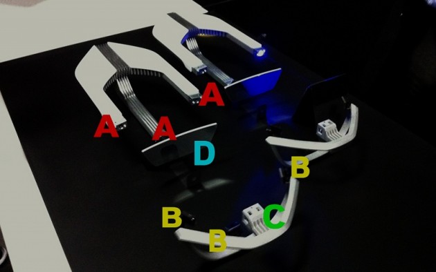 Три лазера (A) установлены на треугольную форму и светят на маленькие зеркала (В), которые перенаправляют луч на линзу С. Внутри линзы C находится желтый фосфор, который под воздействием синего лазера излучает яркий белый свет. Этот свет излучаемый фосфором, перенаправляется линзой на отражатель (D), который отбрасывает свет на 180 градусов на дорогу перед автомобилем. Внутренности фары созданы специальным образом так, что весь созданный свет отражается на поверхность перед автомобилем. Вверху справа на фотографии вы можете увидеть как работает один из 6 лазеров, хоть его луч и перекрыт карточкой. Учтите, что такая конфигурация лишь одна из возможных и можно сделать фары почти любого размера и формы.