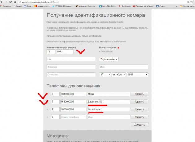 2. Телефоны для оповещения - минимум указанно должно быть 2 номера, при заполнении будьте внимательны, в первой колонке указывается +7, в следующей код и номер