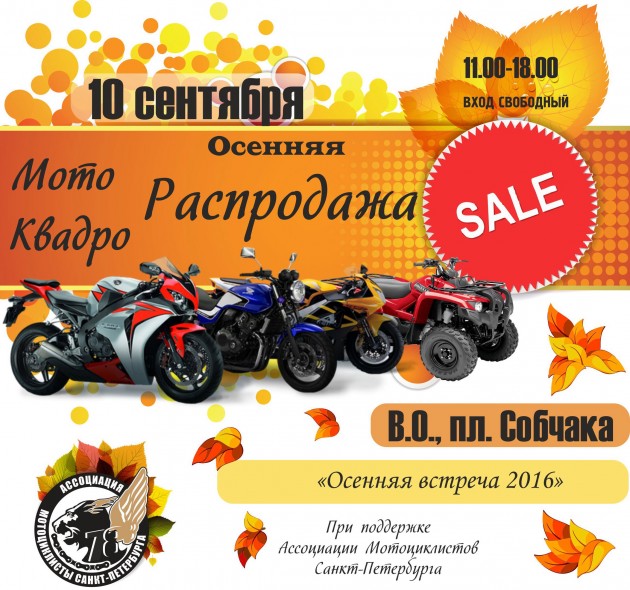 Конец летнего мотосезона – традиционное время для смены техники. 10 сентября, в рамках «Осенней встречи 2016», которая состоится на пл. Собчака (В.О. площадь перед ДК им. Кирова) пройдет первая «Осенняя мотораспродажа» - открытая выставка продажа мото – и квадро техники.