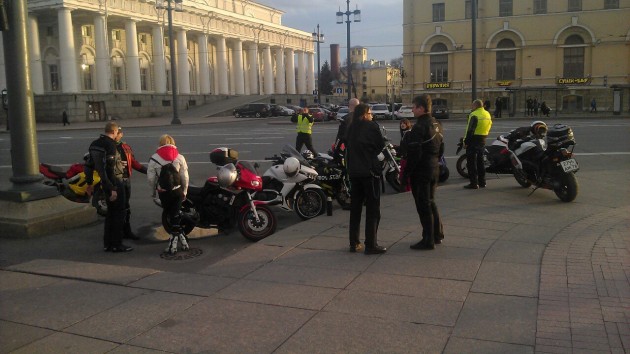 Первый выезд был естественно на работу,ну а по дороге домой ( на Лесную с Ш Революции ) я заскачил на Стрелку. По дороге не встретил не одного мотоциклиста. Думаю,а там есть вообще кто нибудь? Подезжаю. Ооо из завсегдатых Вероника и Дашулька,остальных пока не знаю.