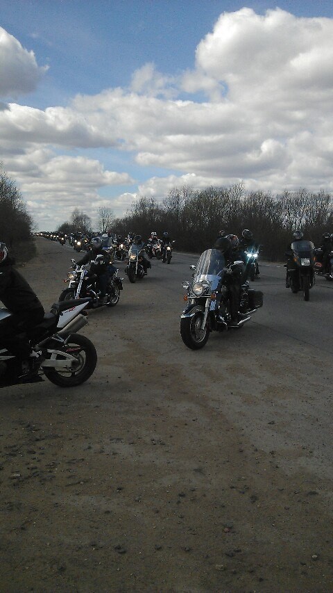 Мотоциклы с которыми я выехал,умчались. Еду по шоссе до КАДа колонны нет, после КАДа решил ехать через город,у ТЮЗа пересекся со знакомым,поболтали. Поехал дальше в сторону КлабХауса. Приехал,народ мечится в процессе подготовки. Мотоциклов нет. Мысль. Блин я походу опять что то интересное пропустил. Колонна приехала минут через 30. Поехали через Ломоносов. Про себя я назвал этот прохват "маршрут потеряшки",но все равно было хорошо,ведь сезон только начанался,а то что было то мелочи, и я знал что зимой я их буду вспоминать с улыбкой,чем сейчас и занимаюсь.