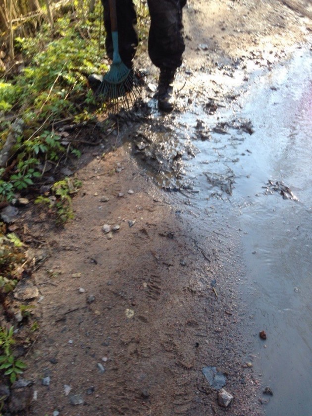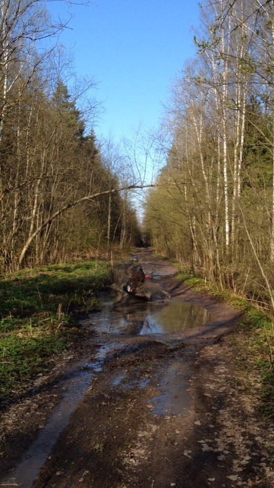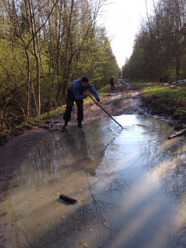 Мы решили ехать в строну дачи на Мягловское шоссе. Но народу много,со стороны Мягловского шоссе тоже оцепление. И тут включается сын, вот там едет по полю машина,мы там тоже проехать сможем запросто. Опять спор,я говорю там нет дороге через лес,мы в Плентовку выкатимся. Ну вообшем,закралась мысля что может это я катаясь в тех местах и до этого,прозевал несколько раз отвилку. До Плинтовки совсем близко,но кромя нас по этой дороге идут пешеходы, пытаються проехать "пузотеры" не знаюшие что самый ушлый их колега уже занял свое место в небольшом ручейке на матизе,перекрыв дорогу.