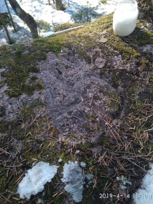 Наверху обнаруживаем следы ритуала - оставленные в качестве жертвы продукты (морковь, картофель, молоко в баночке). Не из религиозных соображений, а по туристической традиции оставляем монетки. Вспоминаю, что на поверхности камня должны быть петроглифы (по другой версии - латинские монограммы молитв). Находим их.