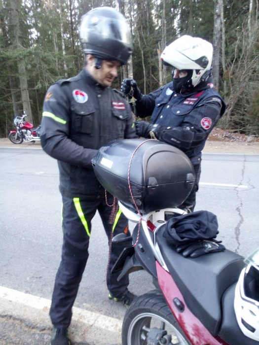 Вынужденная остановка затянулась на 15 минут, но после применения имеющихся у хозяйственного Тракториста "шкотов" кофр был вновь надёжно зафиксирован на своём законном месте и до конца маршрута хлопот уже не доставлял.