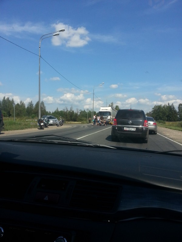 ДТП в 14:05 произошло на Киевском шоссе у деревни Малое Верево, Гатчинский район, Ленинградской области. Мотоцикл врезался в автомобиль, грузовая Scania пропустила, а следующая машина нет. Девушка сидит на дороге и очевидцы оказывают помощь. Об аварии нам сообщила подписчица Яна.