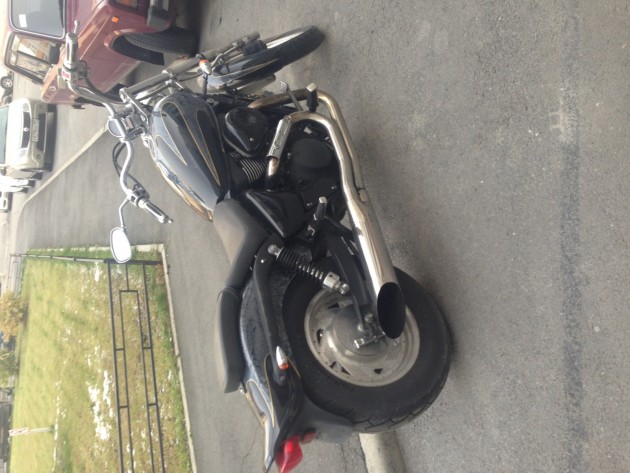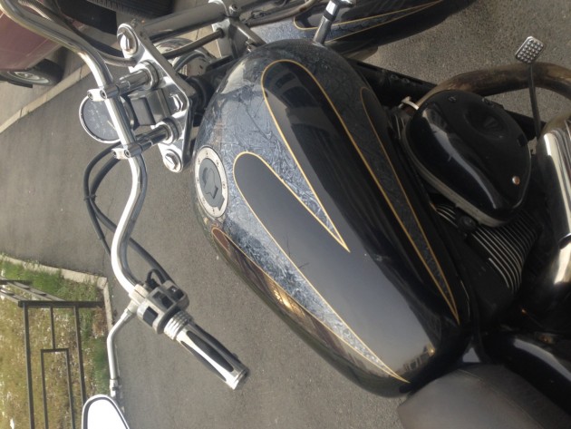 Все лето стоит мотик во дворе без движения. Прикован цепью за переднее колесо с навесным замком. На моте аэрография. Мот без номеров.