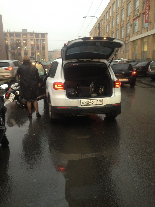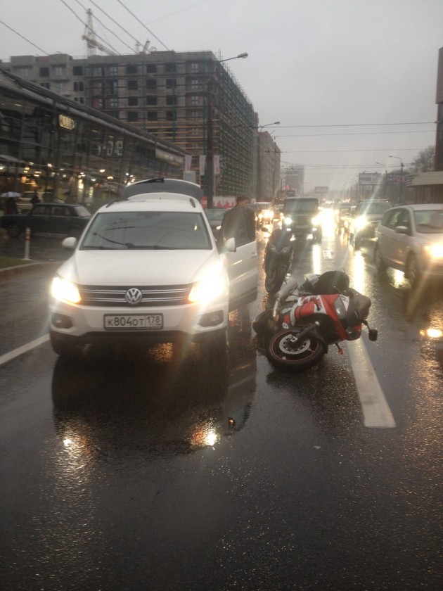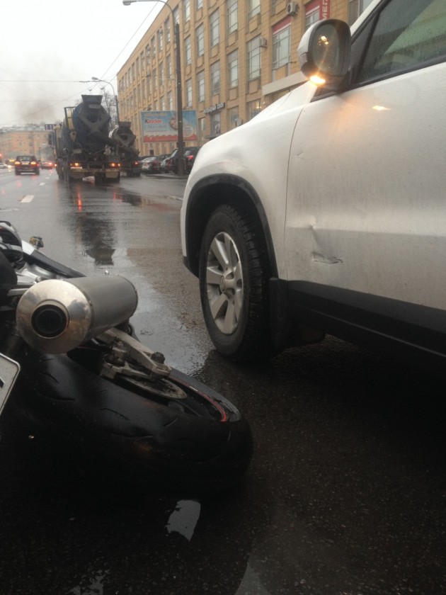 28.10.14 около 9:00. Тигуан из правого ряда перестроился в р6, кот. ехал по среднему. Скорость была небольшая (пробка), пилот цел, в экипе. Дождались гайцов, пилот и женщина из Тигуана (свою вину не отрицала) поехали на разбор полетов. Мот на номерах, документы все в порядке. За мотом попросили присмотреть охранников из салона ауди. P.s. Спасибо остановившемуся человеку на Шевроле Орландо с наклейкой мотобратан.