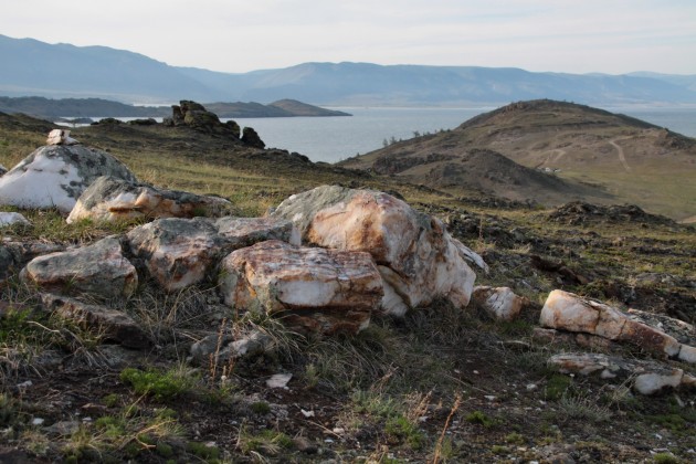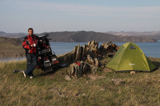 Выдвинулись мы колонной в несколько мотоциклов и машин с иркутскими ребятами, которые по счастливой случайности запланировали эти выходные провести на Малом море Байкала. После совместного преодоления пути до Озера и в процессе начавшихся поисков места для отдыха наши пути чуть разошлись, т.к. наш Мотто-Крокодил отчётливо дал понять, что если мы не прекратим принимать его за тур-эндур, то он обидится совсем (пластик на морде окончательно разболтался после гравийки, и о 80-ти километрах таких дорог по Ольхону не могло быть и речи). Так что разведав что да как с паромом и передвижением по острову без собственного транспорта, мы решили не спешить и отправились искать место для ночлега. Все лучшие места рядом с водой были конечно же заняты (суббота) и нам удалось найти уединенное местечко лишь забравшись повыше в сопку.
