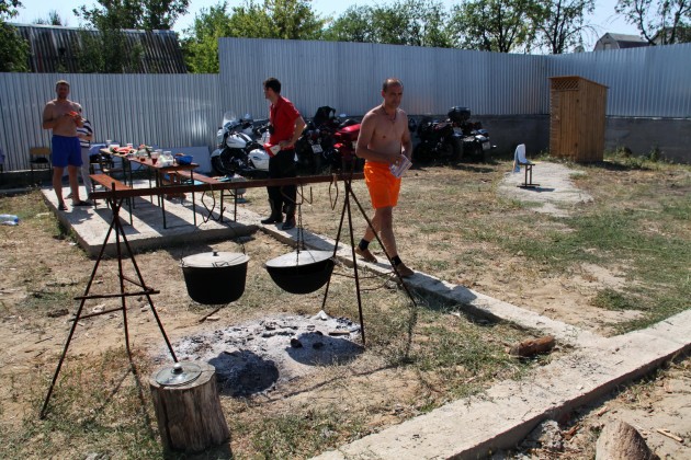 Участники же пробега тем временем расположились на закрытой территории какого-то родственного им автосервиса. Нас приняли как родных. Накормили всякими вкусностями и показали где поставить палатку.