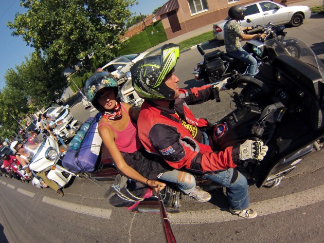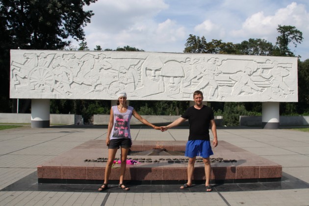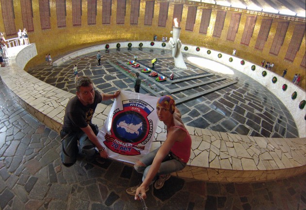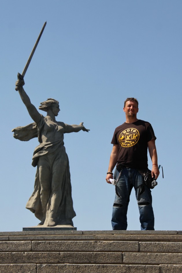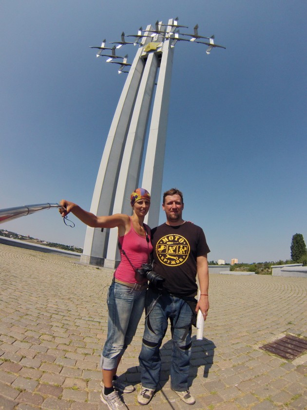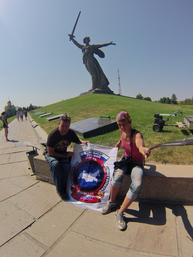 В город мы въехали около полудня и сразу направились в парк Победы к мемориалу «Журавли». Здесь нас ждала очередная «неслучайность»! Как раз в это время здесь стартовало Саратовское звено мотопробега на Севастополь, организованного Ночными Волками и посвящённого 70-летию со дня Победы в Великой Отечественной войне. Мы познакомились, и ребята предложили присоединиться. Их путь лежал через Волгоград в Ростов, где они должны были слиться с основной колонной.