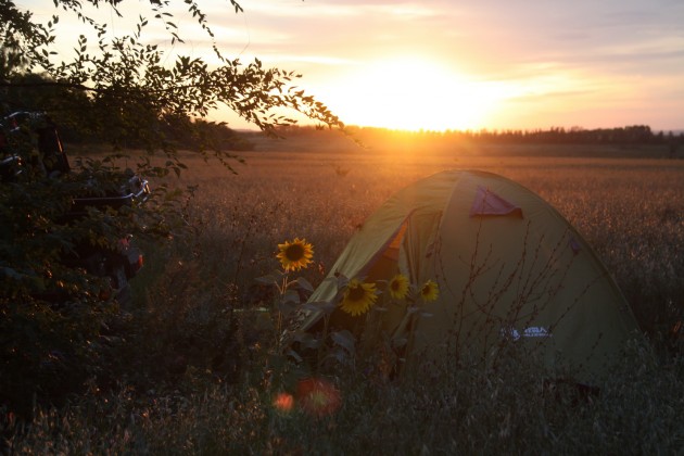 Стартанули поздно - очень уж не хотелось уезжать от Гули)).. Пройдя километров 300, нашли себе место для ночлега в «чистом поле»)). Обосновались на полянке под деревцем, растущем метрах в тридцати от дороги, посреди каких-то злаков). Погода, спасибо ей огромное, как обычно радовала, и вечером был очень красивый закат.
