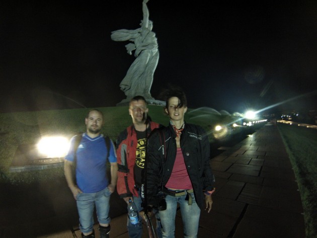 Мы созвонились с нашими новыми знакомыми и узнали место их стоянки. Игорь любезно и даже с радостью согласился провести нас туда. Торопиться было уже некуда, и Игорь предложил по пути заехать на ночной Мамаев Курган, где на возвышении стоит всем известная «Родина-мать». Статуя занесена в книгу рекордов Гиннеса как самая большая на момент постройки скульптура-статуя в мире. Размеры статуи, когда подходишь к ней впервые, потрясают воображение! Общая высота скульптуры - 85 метров, зрелище грандиозное и в ночи, совершенно особенное! По возможности это место лучше посетить как днём, так и ночью.