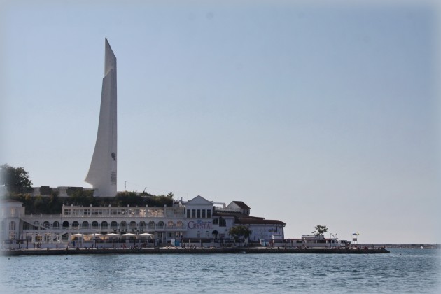 Здесь же и самый узнаваемый из символов Севастополя - «Памятник затонувшим кораблям» - небольшая скала в 20 метрах от берега, на которой высится колонна с парящим орлом на вершине (фото с банером на фоне чуть выше, если кто не был))). Прямо напротив нее, на берегу – памятный знак, посвященный участникам вооруженного восстания под предводительством лейтенанта Шмидта. По ступенькам можно спуститься прямо к морю, многие даже купаются прямо здесь, не доходя до пляжа, ведь вода в Севастопольской бухте остаётся очень чистой, не смотря на судоходство.
