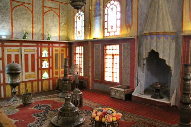 И гиды профессионально повели нас «экскурсионным конвейером» по «единственному в мире образцу крымскотатарской дворцовой архитектуры», очень много и от души рассказывали и про покои Хана, и про уклад, но так же и про то, что ранее площадь дворцового комплекса составляла 18 гектаров, а теперь только 4 гектара, т.к. во время войны Крымского ханства с Россией Бахчисарай был сожжён… Пожар уничтожил большую часть строений, после чего дворец был почти полностью перестроен по сохранившемуся описанию. А после того, как Крым вошел в состав Российской империи, дворец ещё много раз перестраивался, в результате чего здания изменили свой первоначальный вид.