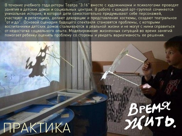 На этом фестивале будут представлены итоговые спектакли годовой работы с детьми из Петербургских приютов и детских домов. Спектакли, представленные на фестивале, отличаются от обычных театральных постановок. Особенность их в том, что детям предоставлена полная самостоятельность в постановке спектакля. Под руководством актеров Театра Импровизаций «3:16», а также психологов дети проходили путь от простого актерского тренинга до постановки полноценного спектакля, в котором все персонажи и сюжет – это воплощение их переживаний, мыслей и желаний. С помощью художников они сочиняли и воплощали сценографию, костюмы, реквизит. В конечном итоге родился готовый, законченный авторский спектакль, где все, даже не участвующие непосредственно в действии вовлечены в процесс.