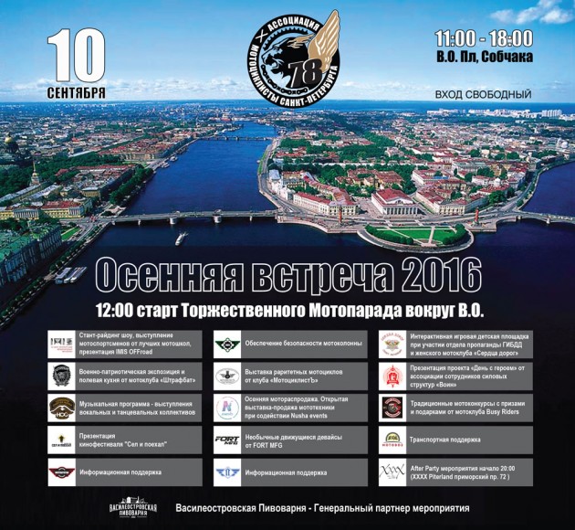 И теперь, в рамках празднования, закладывается новая городская традиция: проведение осенних мотовстреч. Ассоциация «Мотоциклисты Санкт-Петербурга» приглашает всех желающих принять участие в праздничном Open-Air, который пройдет на пл. Собчака, у ДК Кирова. Подобный объединяющий формат праздника отражает основной принцип Ассоциации - «Объединение многих - на благо каждого».