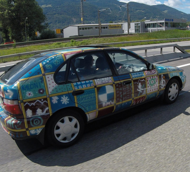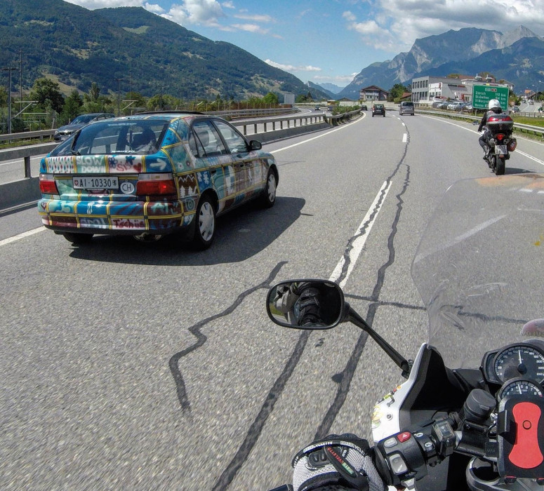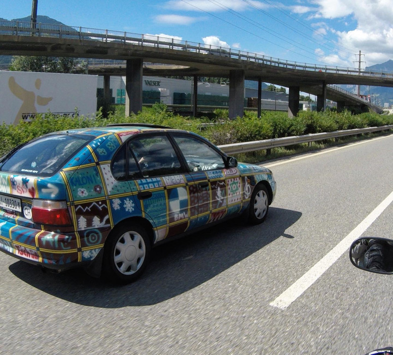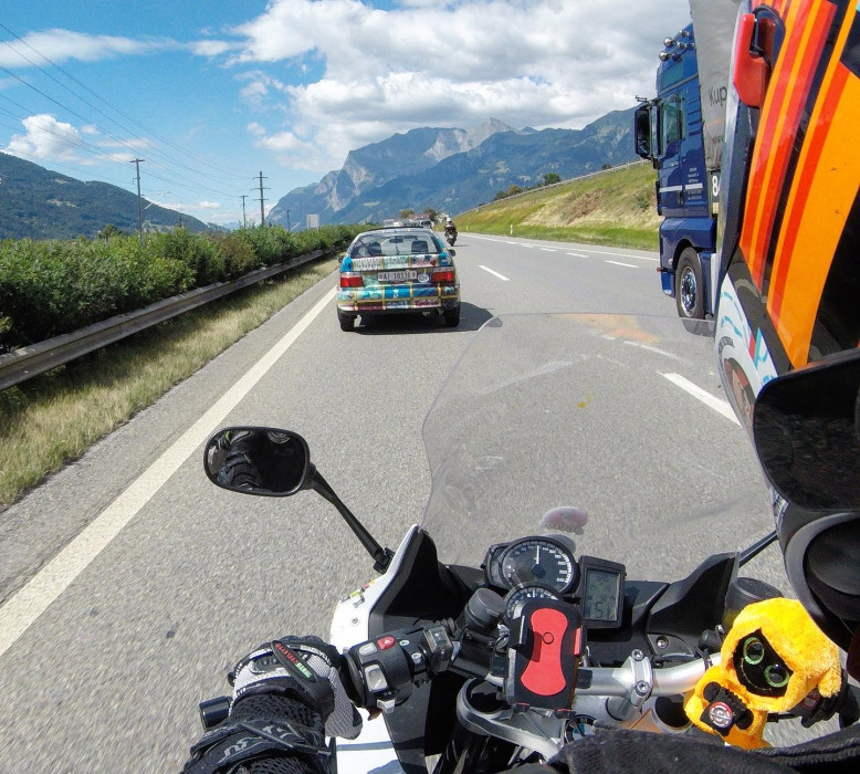 И вдруг появляется яркое пятно, дающее тебе силы и немного выбивающее из колеи. Одним из таких пятен стала эта милая машинка, которая играла с нами в догонялки на пути через Швейцарию и Лихтенштейн.