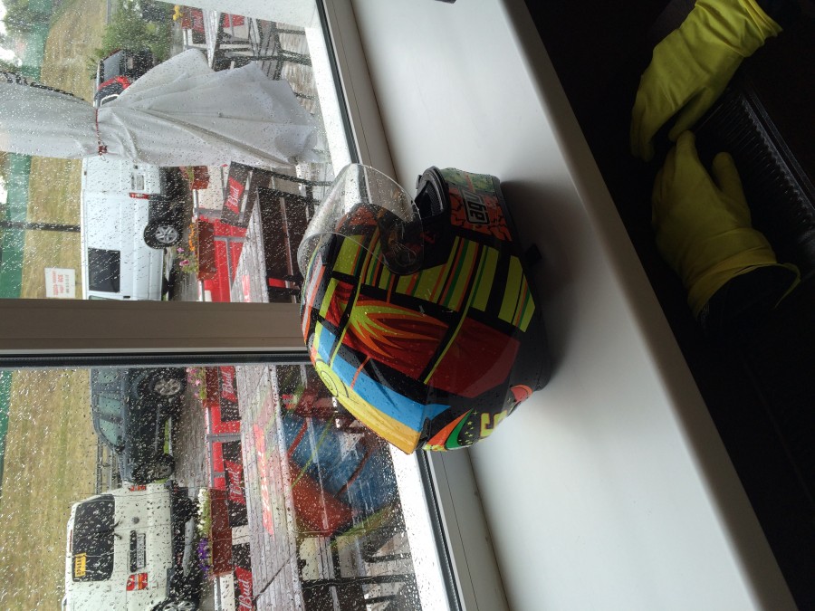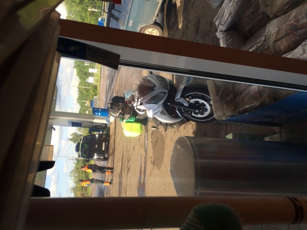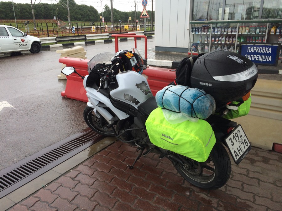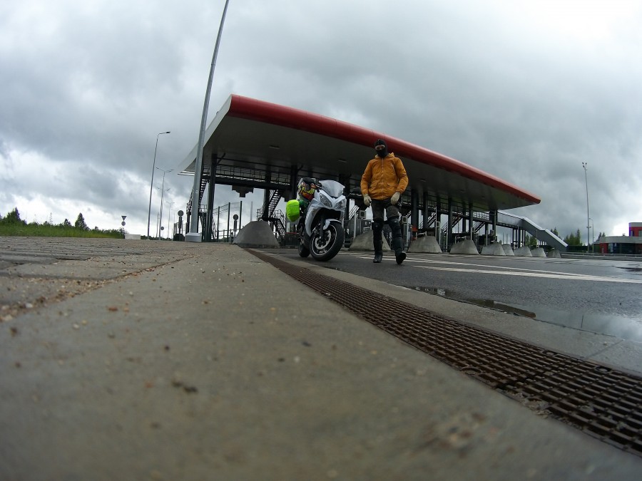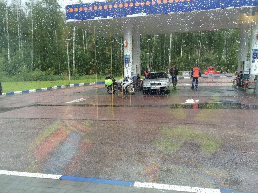 Очередная заправка. Выпил горячий чай и сел ждать, когда дождь станет чуть меньше, т.к. ехать стало совсем тяжело - нихрена не видно. Мотоцикл поставил у колонки под крышей, чтобы хоть сиденье оставалось сухим, а заправщик огородил это место конусами, чтобы машины к нему не совались. Спасибо тебе, друг, пусть работа твоя будет легкой и денежной. Т.к. ноги были насквозь мокрые, я переодел носки и засунул ноги в пакеты, которые мне любезно предоставила девушка на кассе, и всю эту конструкцию поместил обратно в мотоботы. Вообще, хорошая это была заправка, с хорошими работниками, жаль не запомнил название и место.