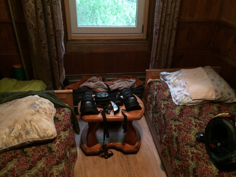 Охранник сказал, что если заранее не бронировали, то мест нет, что пустить на пару часов согреться он тоже не может, и вообще, в 20 км отсюда есть какой-то поселок, может, там мне повезет, а здесь завтра большой заезд и лучше мне убраться. Двадцать километров я бы не протянул, поэтому сказал, что поставлю палатку прямо у ворот, и пусть делает со мной, что хочет. Он тут же позвонил кому-то, и нашлось место в пустом 4-хместном номере класса «эконом» аж за 600 рублей. Вообще, здание, в которое меня заселили, было полностью пустым. Редкий персонал вел себя так, будто тут 5-тивездочный отель. На деле же это был богом забытый комплекс в упадке и запустении, с синими крашеными стенами, фанерными тумбочками, окнами, заклеенными бумагой, и грязным шлангом, торчащим из стены, который они гордо именовали душем. Но спать можно, так что все окей, я не прихотливый. Съехать попросили не позднее 8-ми утра, встаю я раньше, поэтому это не проблема. Заселился, развесил вещи на батарее и уснул.