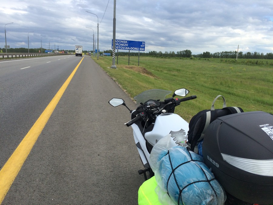 На оном из платных участков, уже по-моему в Воронежской области, на месте отдыха встретил байкера, который на машине всей семьей ехал в Анапу, а свой харлей вез в прицепе. Он посетовал, что из-за малолетнего сына не получается ехать верхом, поэтому везет железного коня за собой.