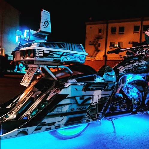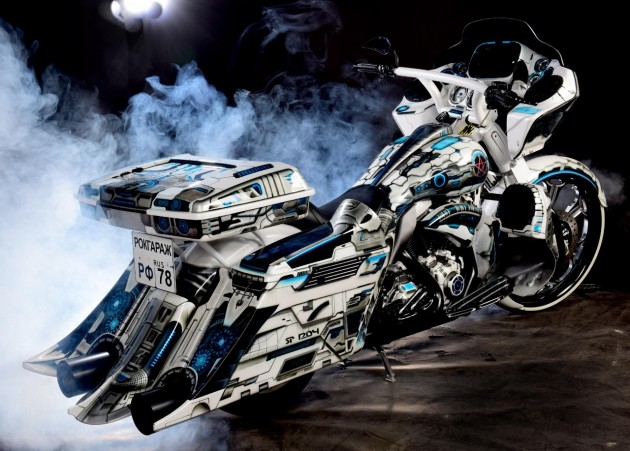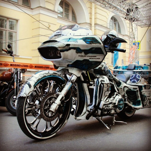 Первый эскиз подразумевал аэрографию летящего космического лайнера сквозь вселенную и звезды, но в процессе работ стиль несколько изменился и весь мотоцикл был стилизован под космический челнок. "Самолетные" рычаги управления отвечают за работу светового оборудования транспорта: внутренняя подсветка, подсветка мотора, снизу, сзади и на спойлере. iPad заменил штатное головное устройство, с тачскрина владелец управляет звуком мотоцикла.