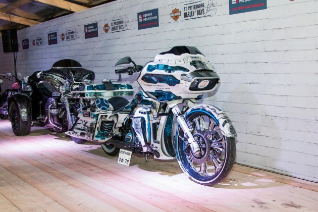 В данном проекте очень много ручной работы специалистов ателье GraphCustom, в частности стеклопластиковый обвес полностью был создан в этой мастерской. Некоторые пластиковые элементы создавались с чистого листа и не имеют аналогов даже за границей, например, расширенный и увеличенный средний чемодан, в который установлен сабвуфер. Спойлер на чемодане также уникальный, созданный по фантазиям Сергея и имеющий вид реактивных двигателей космического корабля. Переднее крыло спроектировано лично Анатолием Graph и имеет оригинальную форму, закрывающую больше половины диаметра колеса так, что без хитрости его не установишь.. Единственный в своем роде передний фейринг спроектирован и создан из единого куска углепластика. Добавлена характерная хмурая бровь, под которой размещена диодная оптика новейшего поколения Harley Davidson RoadGlide oem.