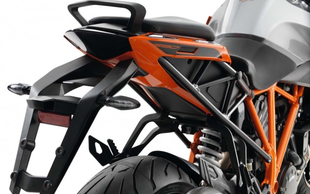 Спортивно-туристический байк разработали на базе стритфайтера 1290 Super Duke R, в отличие от которого модель Super Duke GT имеет большой 23-литровый топливный бак. Что касается электроники, то мы можем отметить полный пакет: курсовая устойчивость, трэкшн-контроль и антиблокировочная система с чувствительностью угла наклона. Новый мотоцикл рассчитан на длительные путешествия, поэтому комплектуется удлиненным подрамником с креплениями для кофров, ручками с подогревом, круиз-контролем, более комфортным седлом, регулируемым ветровым стеклом, светодиодными фарами ближнего света, адаптивным освещением поворотов.