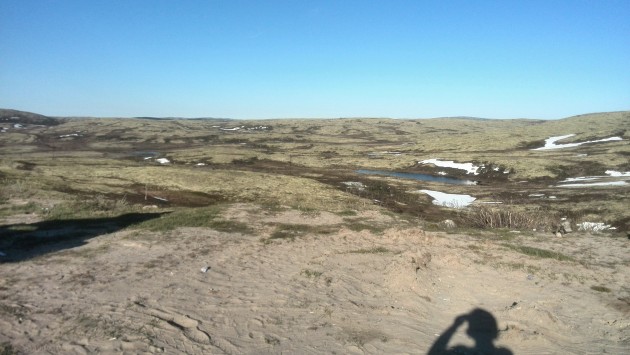 Еще будучи в Варзуге условились встретиться с организатором мероприятия в 17.00 на повороте из Мурманска в Териберку. Но что-то там у него не срослось, и все туристы поехали самостоятельно. От Мурманска ехать примерно 80 км по вполне себе сносному асфальту через тундру, и еще 40 км - по щебневому грейдеру. Когда выезжаешь за Мурманск - сразу замечаешь смену ландшафта, деревья становятся маленькими, корявенькими, по сторонам сплошные болота и снег на обочинах.