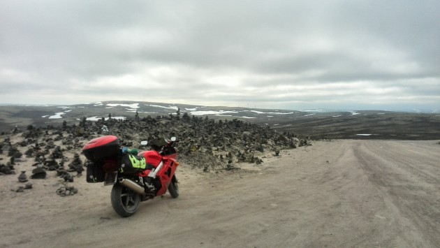 Было решено на утро выбираться из бухты. А дальше - кто куда. Кто-то домой, кто-то в Мурманск на авто-пати, а я - в Хибины. Проснувшись и позавтракав, я водрузил на мотик свой нехитрый скарб, и, со всеми попрощавшись, двинул в сторону Мурманска по любимой, и ставшей практически родной, гравийке, периодически останавливаясь для фото.