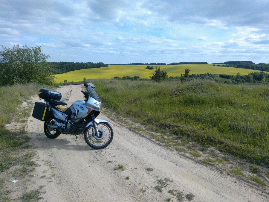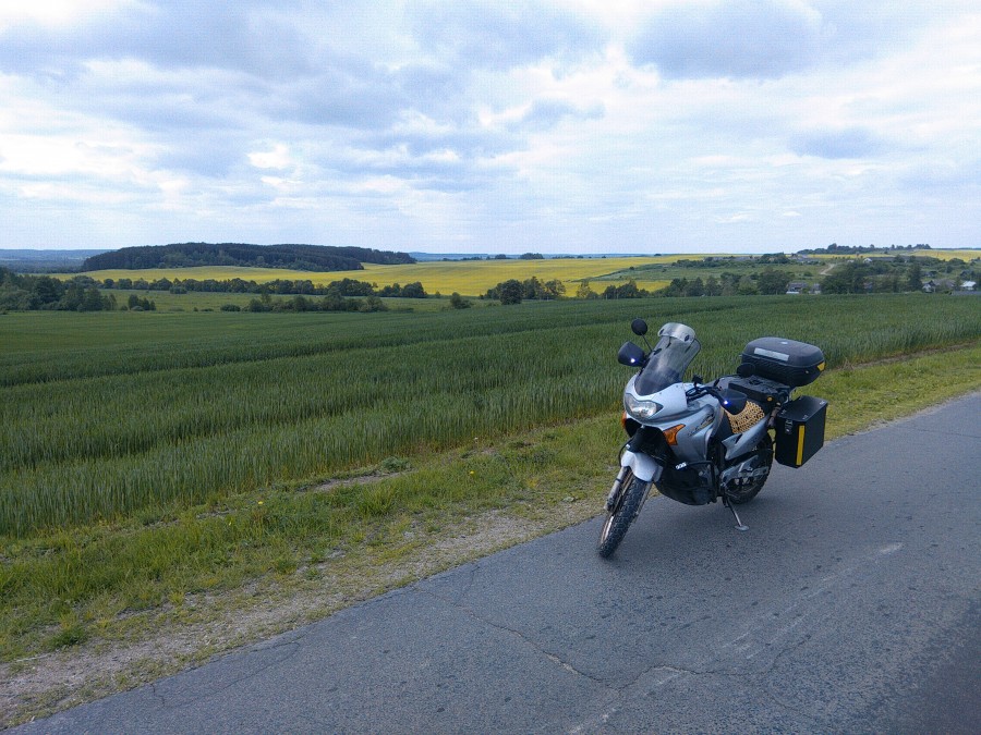 Уходя за горизонт, дорога петляет по холмам, то огибая их у подножия, то перебираясь через вершины. По сторонам мелькают то небольшие хозяйские дворы, то перелески, то какие-то сельскохозяйственные постройки неизвестного мне назначения. На очередном подъёме я привычно сбрасываю передачу, слегка добавляю газ и, поднявшись на самый верх… перестаю дышать. От открывшегося пейзажа перехватило дух, руки и ноги сами остановили мотоцикл прямо посреди дороги, я слез с него, вошёл в поле и только теперь глубоко вдохнул. Это именно тот вид, который я искал, ради которого провёл в дороге несколько дней. Пробивающееся через облака солнце ярко раскрасило простирающиеся до самого горизонта поля, которые переливаясь множеством оттенков жёлтого и зелёного, перемежаются между собой. Ни машин, ни людей, лишь уходящая вдаль дорога, шум птиц, и принесённый ветром аромат полей.
