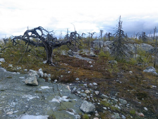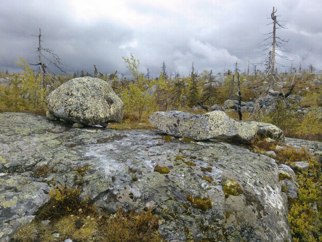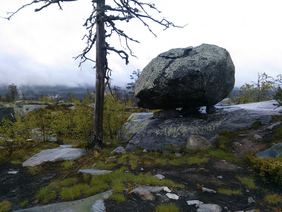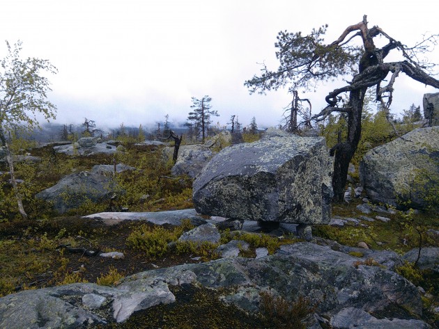 Взять гида было правильным решением. И это не просто местный мужик, который зарабатывает копеечку на туристах; Михаил родился и вырос в этих местах, а сейчас работает в местном лесничестве. Много, очень много интересного он рассказал нам и показал, без него немало красот и диковин ускользнуло бы от наших глаз. И пусть в его рассказах хватало фольклора и плодов богатого воображения, но, безусловно, есть в этой горе что-то мистическое. Огромные камни, непонятно каким образом оказавшиеся будто подвешенными над землёй. Деревья, стволы которых закручены необычайным образом, будто они упираются во что-то в небе и не могут расти ввысь. А пожарище на вершине горы лишь добавляет мистики этому месту. К полудню дождь иссяк, облака поднялись и нам открылись потрясающие виды окрестных земель. Так я познакомился с Воттоваарой.