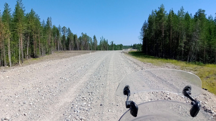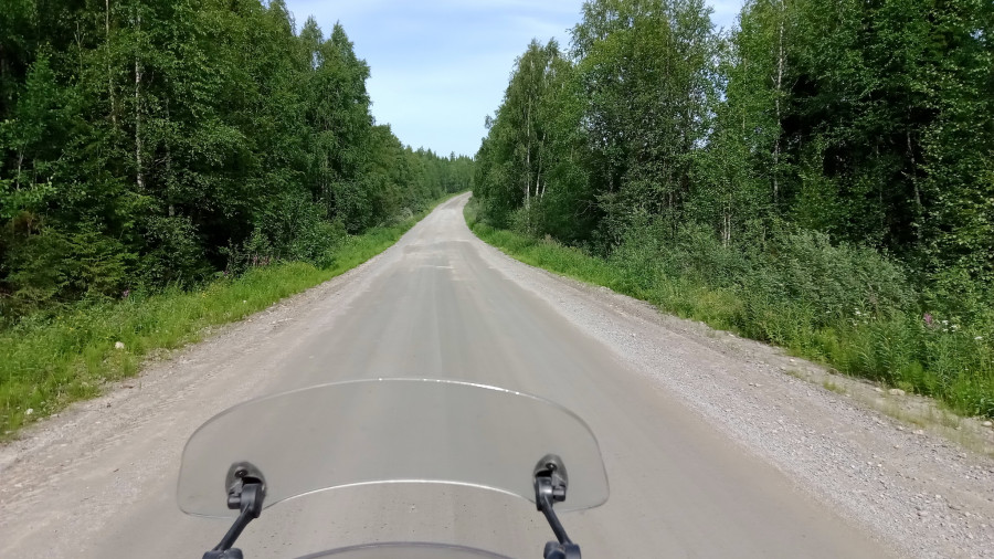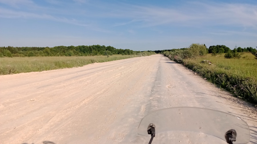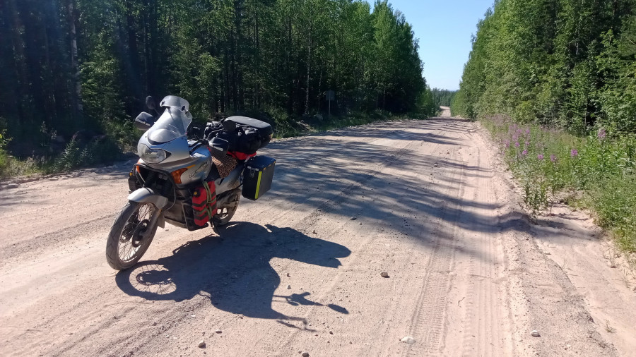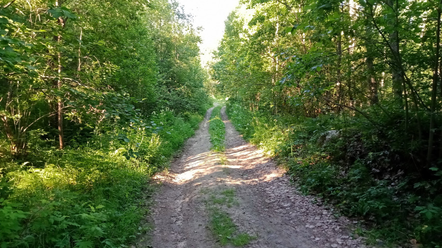 Ровная укатанная грунтовка уходит в лес. На тридцатиградусной жаре что может быть прекрасней, чем наконец оказаться в тени? Вроде и ехать можно быстро, а я уже не хочу. Мне хорошо в этом лесу. Останавливаться не буду, пусть местная мошкара останется голодной, но и рваться обратно на солнце не тороплюсь. Да и красиво здесь, умиротворяюще.