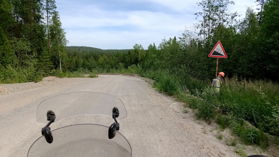 Лесная дорога, узкая, с торчащими камнями, хоть и укатанная. Впереди поворот, а перед ним желтый знак 40 – страшно подумать, что там за ужас, если на такой дороге поставили такой знак. Оказался крутой поворот со спуском, за которым смыло половину покрытия на внешней стороне. Я хоть и не гнал, проехал бы аккуратно, но всё равно спасибо, дяденьки дорожники.