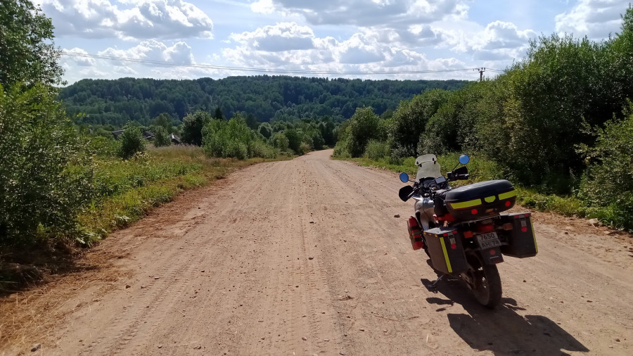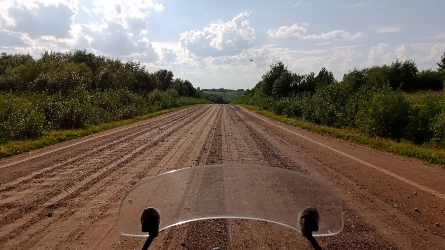 Совсем недавно здесь прошёл грейдер, выровняв ямки, но теперь вся дорога покрыта слоем не укатанного грунта и вывороченными из земли камнями разных размеров. Переднее колесо закапывается, мотоцикл кидает, приходится ехать неспешно, практически не опускаясь в седло. Но что это жёлтое виднеется там, вдали? Да это же тот самый грейдер! Через пару минут я проезжаю мимо, глядя на с жадностью поглощающего бутерброды водителя, и дорога чудесным образом преображается. Да, теперь есть ямки, но я набрал свою скорость, и они мне уже не интересны.
