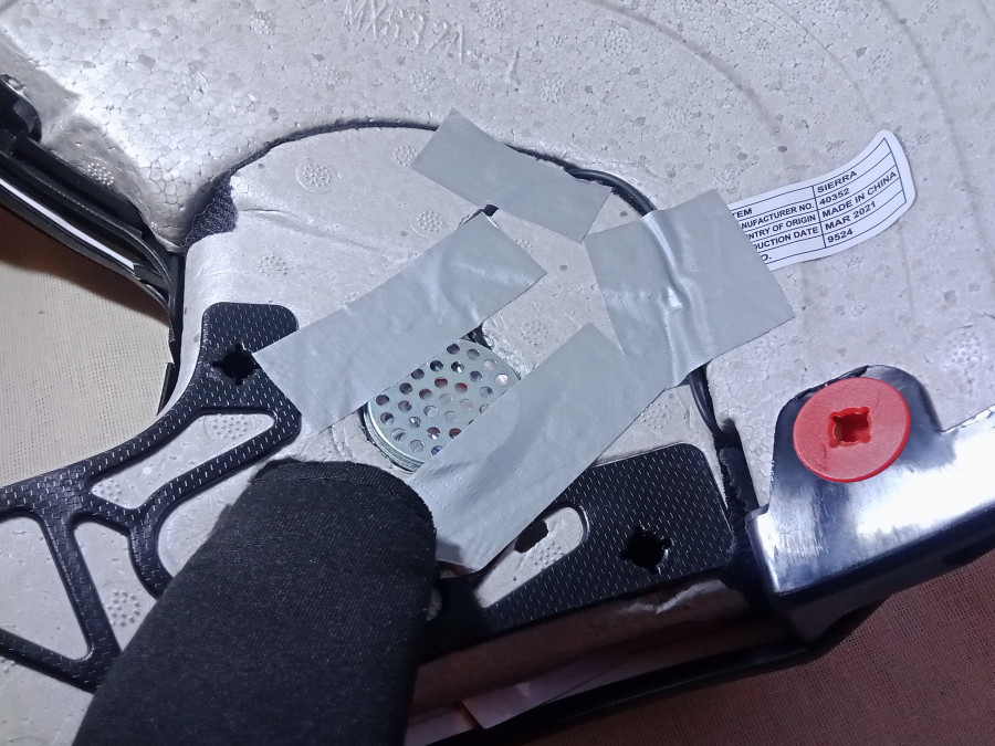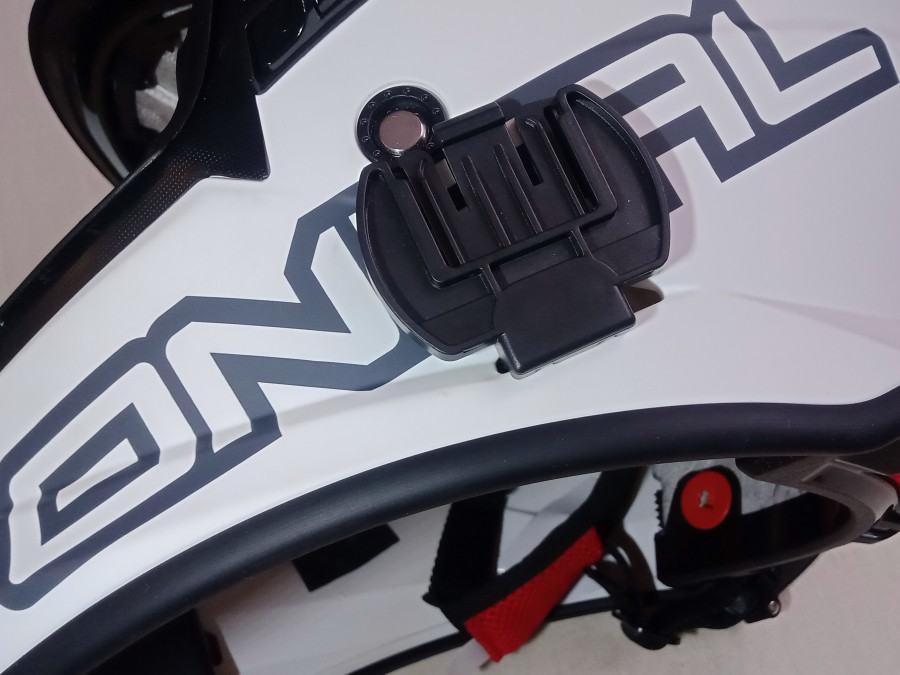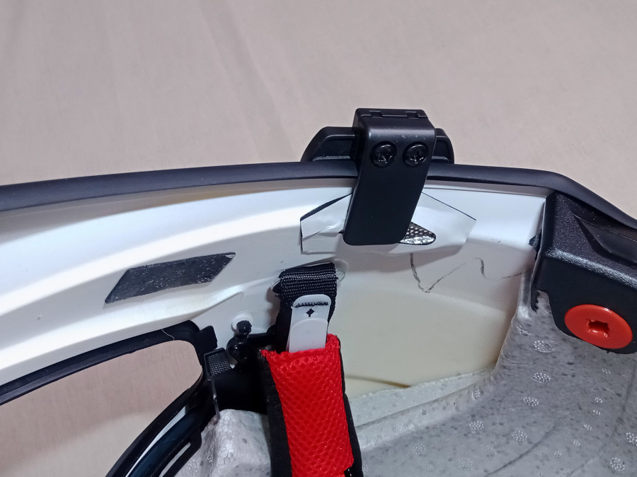 По идее можно приклеить основание к шлему на двусторонний скотч, что кажется не очень надёжным, или использовать какой-нибудь ядрёный клей, но мне повезло – как раз в месте установки в моём шлеме есть маленькое псевдо-вентиляционное отверстие, через которое я и пропускаю два винта крепления.