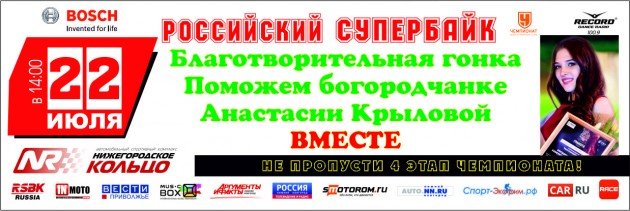 Организаторы сообщают, что 100 рублей с каждого проданного билета на мероприятие будут переведены на лечение Анастасии Крыловой. Девушка пострадала в тяжелом ДТП, которое произошло 20 мая на трассе Богородск — Ключищи. Анастасия возвращалась из Нижнего Новгорода с гонки I этапа RSBK 2017, которую она посетила как зритель. В данный момент девушка оперативно нуждается в дорогостоящем лечении. Организацией благотворительных мероприятий в поддержку Анастасии Крыловой занимается Молодежная палата Богородского муниципального района. Вся семья RSBK присоединяется к этой организации и призывает помочь Анастасии Крыловой вместе с нами.