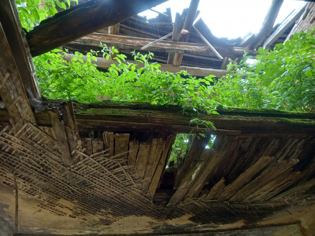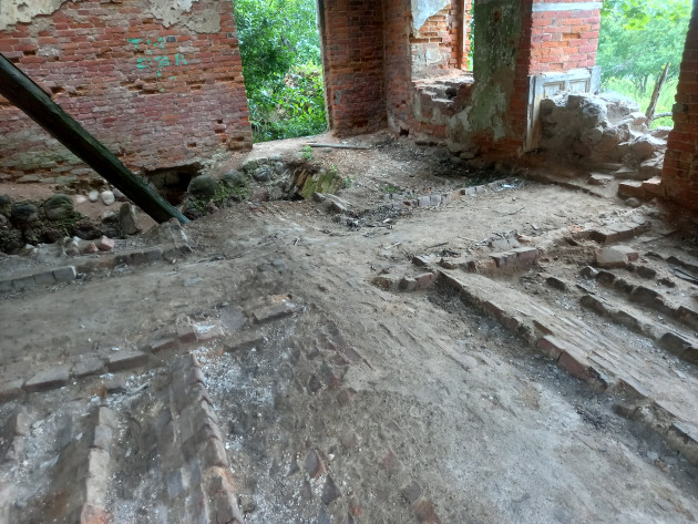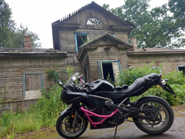 Так, никуда не сворачивая, через Волосово я добралась до усадьбы барона Вейрмана (59.408514, 29.329523). Усадьба была деревянная, господский дом сгорел еще в 2018 году, я не стала туда лезть, но спряталась от нарастающего дождика во флигеле. Он тоже в удручающем состоянии, но ещё можно подняться на второй этаж. После революции оба дома использовались под квартиры обычными людьми, всюду поломаные вещи, детские игрушки. Единственное что выдает в доме богатое убранство помимо строения - это остатки лепнины на потолке и проглядывающая сквозь мусор паркетная доска.