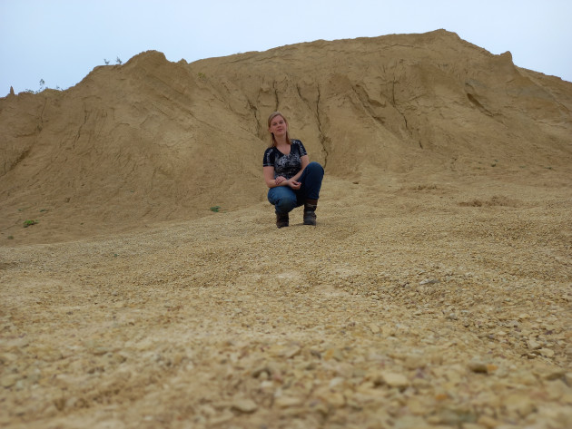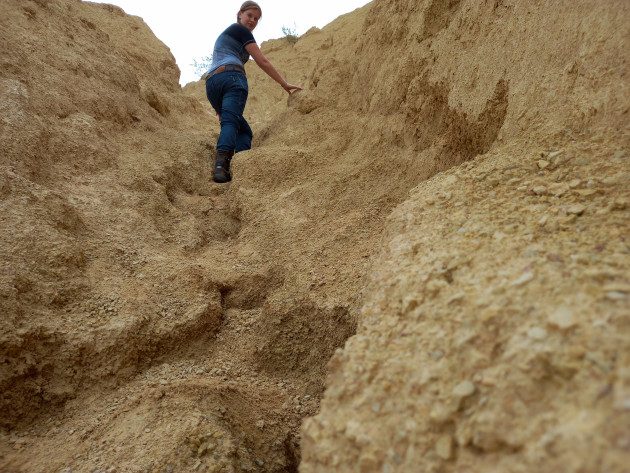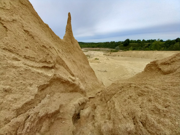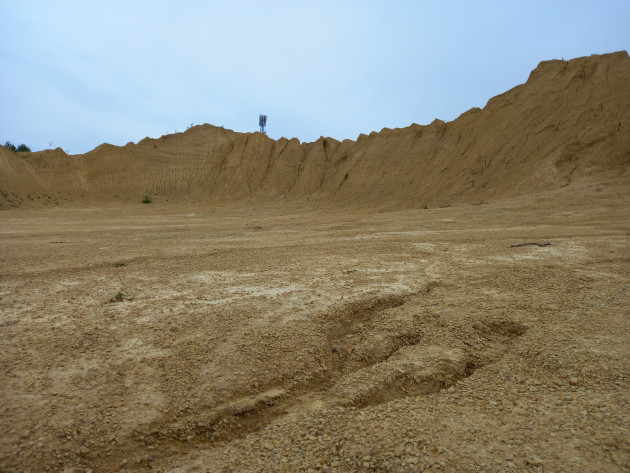 Я не стала в одиночку испытывать судьбу и прошлась 800 метров пешком. Вот раздолье для эндуриста! Дорога передо мной вся испещрена следами от шин, всюду в стороны уходят следы по тропинкам.Сам карьер действительно выглядит фантастически непривычно для наших пейзажей. Издалека он похож на песчаник, но вблизи видно что это известняковый гравий(?) и не осыпается так под ногами.