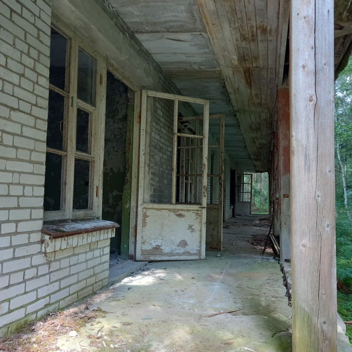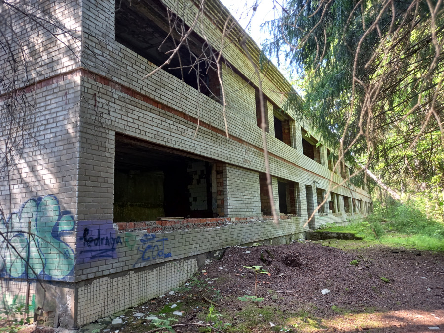 Также с дороги видны первые корпусы, самые разрушенные. От окон и дверей почти не осталось и следа. Тропинка ведет, изрядно утоптанная, разветвляясь, к разным зданиям.