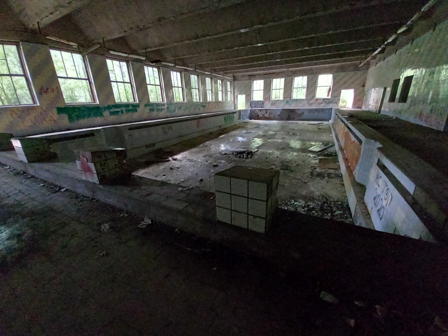 Дошли до здания дома культуры(?), внутри очень атмосферно, фото не передает. Увы, крыша уже провалилась в зале и вот-вот упадёт в фойе.