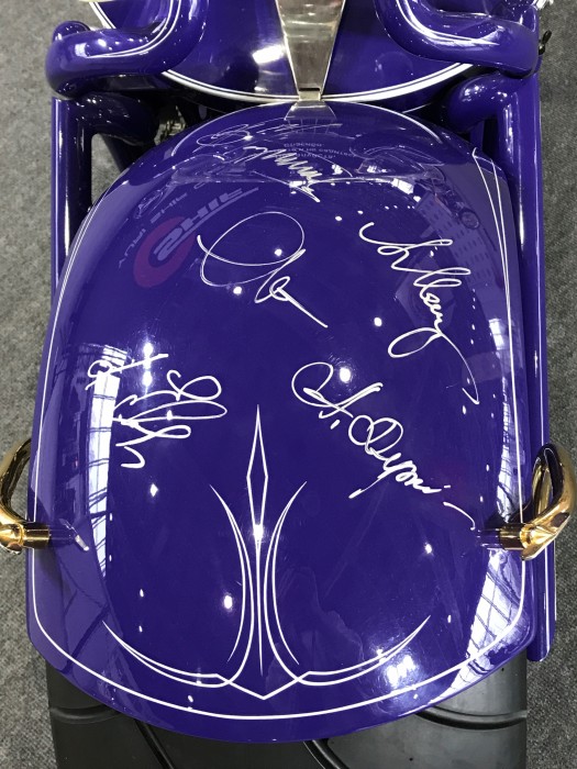 Кастомбайк “Time Machine”. Мотоцикл, который вызывает восторг у всех, кто даже не знаком с техникой. “Всё преходяще, а музыка вечна!” В модели нашло отражение творчество конца 70-х и начала 80-х годов легендарной группы “Машина Времени”. Основным элементом мотоцикла стала бас-гитара “Орфей”, она изготовлена из металла и является несущей конструкцией, верхней частью рамы. Творческую идею дополняют автографы всех участников музыкальной группы.
