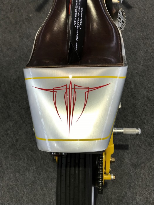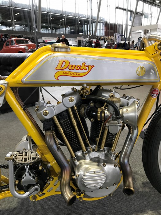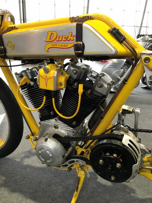 Кастомбайк “Ducky”. Модель, которая похожа на велосипед с мотором, … да, именно так … Это борд-трекер, байк, сделанный в стиле мотоциклов, предназначенных для гонок на дощатых треках, некогда любимых в Америке. Данная модель в течение трех дней была собрана и заведена на одном из популярных немецких фестивалей.