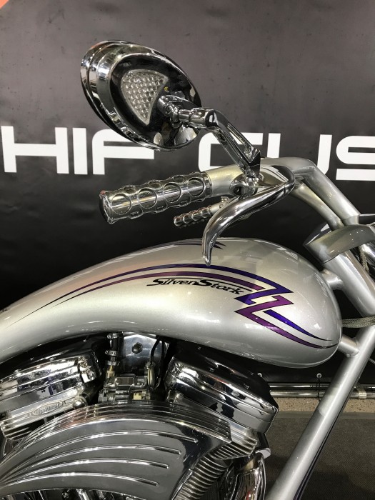 Кастомбайк “Silver Stork” (англ. “Серебряный аист”). Неудивительно, что один из белорусских символов дал название этому мотоциклу, так как именно в Минске была основана мастерская Юрия Шифа. Вглядываешься в гармонию четких линий, плавных изгибов, удачно подобранный цвет и кажется, что мотоцикл взлетит, словно птица, расправив свои крылья. Кстати, о “крыльях”, в этом кастомбайке использована прогрессивная пневмоподвеска и механизмы управления, спрятанные внутри руля.