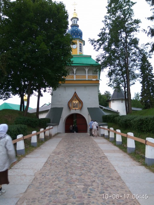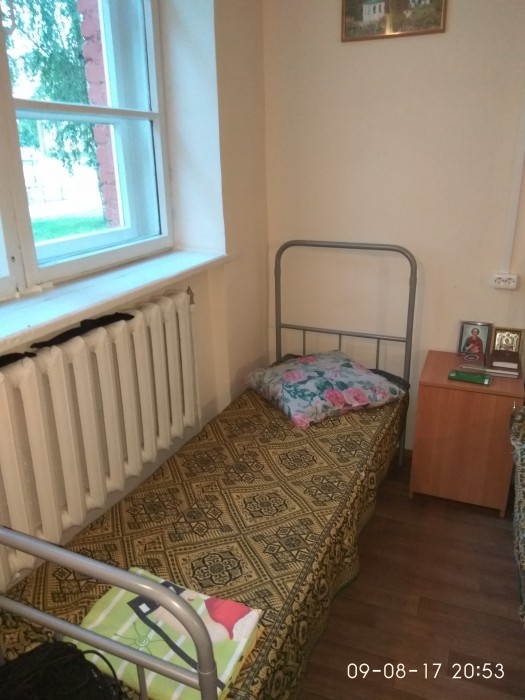 Слева от входа на территорию монастыря есть двухэтажное здание паломнической службы: та меня оформили, выдали какую-то бумажку на заселение и отправили в бывший военный городок в 2 км от монастыря. Территорию раньше занимала военная часть десантных войск, но затем часть перевели из-за требований соседей-эстонцев, которые жаловались на расположение на расстоянии менее 1 км. частей специального назначения. В общем, в данный момент территория принадлежит монастырю.