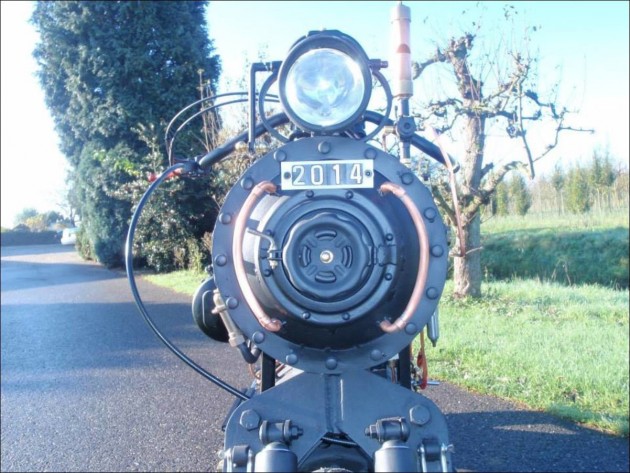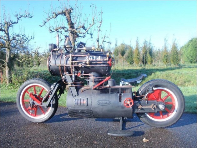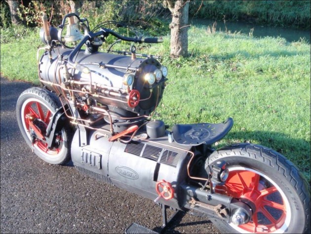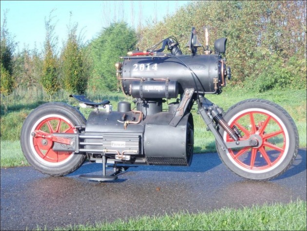 Голландские инженеры из Revatu Customs построили мотоцикл на паровой тяге и назвали его «Черная Жемчужина». Принцип работы как у паровоза — в топке горит уголь, вода нагревается, пар крутит турбину и приводит мотоцикл в движение.